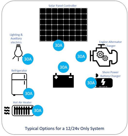 The diagram on the left/above gives a few ideas of what you could use BatMon 30A for. If you have an Inverter , you may want to switch out the 30A BatMon on the Battery for a 300A version at a slightly higher cost (available in the store also).